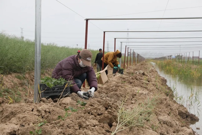 5月8日,在濱淮農(nóng)場高效農(nóng)業(yè)中心,一群志愿者正忙碌在溝邊的零星隙地,他們搬苗、栽種、覆土,精心種植瓜蔞,為原本荒蕪的溝邊增添了一抹生機(jī)與希望。